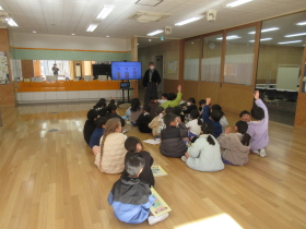 昼休みにおはなし会を開催しました。子どもたちは拡大絵本に釘付けです。 |
