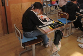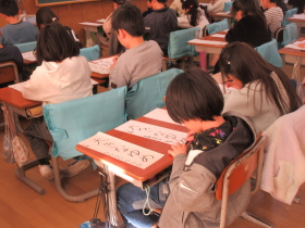 新年に初めて筆を使って文字や詩などを書く日本の伝統行事として、書き初めを行いました。低学年は筆ペン、3年生以上は毛筆で真剣に取り組む様子が見られました。 |