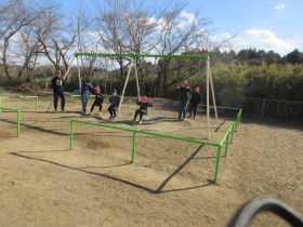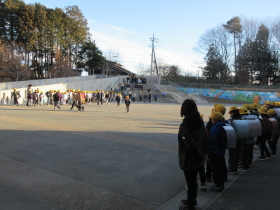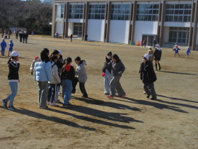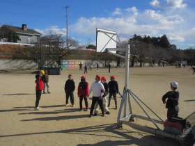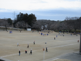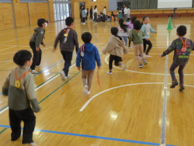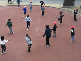 昼休みは寒さに負けず多くの児童が外で遊んでいます。プレイコートでは1年生が校長先生と一緒に縄跳びをしていました。 |
