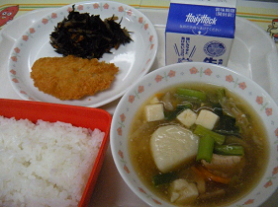 【ご飯、アジフライ、ひじきの炒め煮、のっぺい汁、牛乳】 |