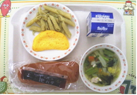 【コッペパン、チョコクリーム、プレーンオムレツ、ペンネバジルソース、鶏肉と白菜のスープ、牛乳】 |