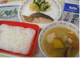 【ご飯、鮭の塩焼き、即席漬け、イモゾー汁、70周年記念のり、牛乳】 |