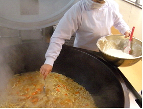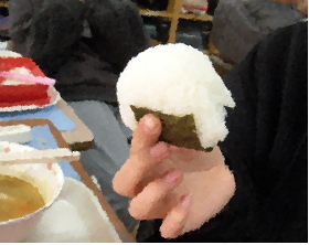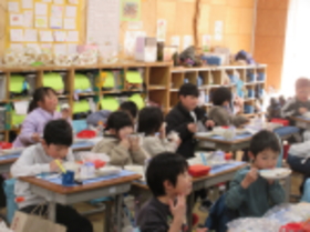 1月24日~31日は学校給食週間です。今日は明治22年日本で最初に出された給食を基にしたメニューでした。自分で焼きのりを巻いたおにぎりをおいしそうに食べていました。 |