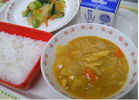 【ご飯、昔のカレー、こんにゃくサラダ、牛乳】 |