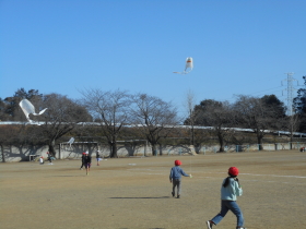 1年生の生活科で、昔からある遊びの体験として凧あげを行いました。思い思いのデザインが描かれた凧を一生懸命走りながらあげていました。 |