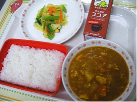 【ご飯、アレルゲンフリーカレー、コーンサラダ、ココア豆乳】 |
