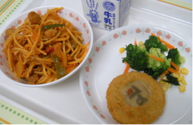 【ミートスパゲッティ、50周年記念コロッケ、ブロッコリーサラダ、牛乳】 |