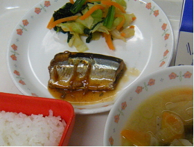 【ご飯、さんまの煮つけ、しょうが和え、実だくさん汁、牛乳】 |