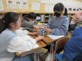 1年生の図工で色水づくりに挑戦しました。絵の具にある色だけでなく、自分の作りたい色にするにはどの色をどのくらい混ぜたらいいかを考えながら思い思いの色水を作りました。できあがった作品は写真で保存し、配色や量について記録していました。次の時間はそれをみんなで発表し合い、作品のよさを認め合います。 |
