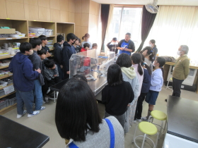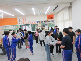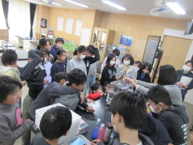 3年生がクラブ活動を見学しました。クラブ長が活動内容を紹介したり、3年生に活動の様子を見せたりしていました。また、理科クラブはJ-PARCの出前授業で真空圧実験を見せていただき、真空圧砲で空き缶に穴が開いた威力に驚いていました。 |