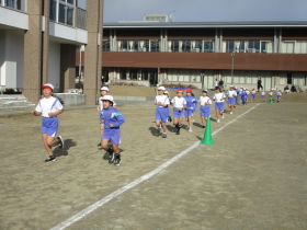 持久走大会に向けて、中休みに「ランランタイム」を設けて走っています。音楽が鳴っている間、それぞれのペースでグラウンドを駆け回っています。 |