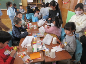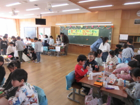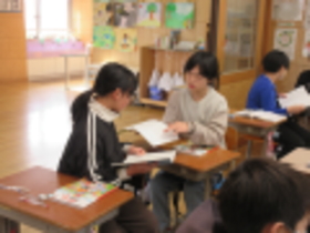 2年生の生活科で「おもちゃワールド」づくりを行いました。身の回りのものを使って友達と協力しながら様々なおもちゃを作りました。そこに1年生を招待して、作ったおもちゃで遊びました。遊び方を教えたり一緒に工作したりして楽しい時間を過ごしました。 |