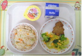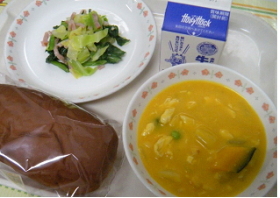 【胚芽パン、タンドリーチキン、寒天入りヘルシーサラダ、オニオンスープ、牛乳】 |