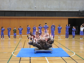 児童の自主的な発表をみんなで認め合う場として、今回は「お手玉」と「組体操」の発表でした。お手玉には先生も飛び入り参加。6年男子によるピラミッドは見事でした。 |