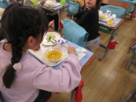 【けんちんうどん、さつま芋の天ぷら、昆布和え、牛乳】 |